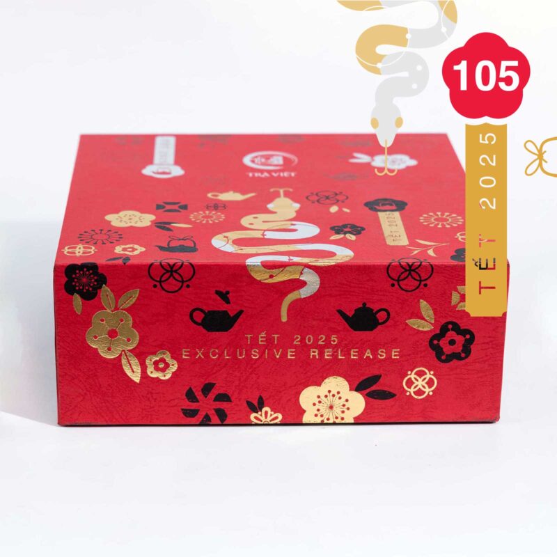 Hộp quà Tết số 105 của Trà Việt là hộp quà tết cao cấp, kết hợp giữa bộ ấm trà sứ trắng và trà ngon. Bên trong hộp quà tết này gồm có: