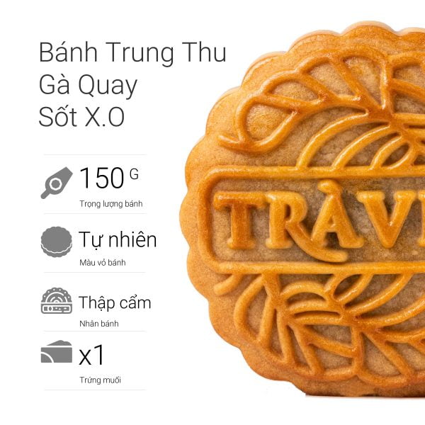 - 1 Bánh Trung Thu Gà Quay Sốt X.O: Vỏ vàng tự nhiên, nhân gà quay sốt X.O, 1 trứng muối, 170 gram.